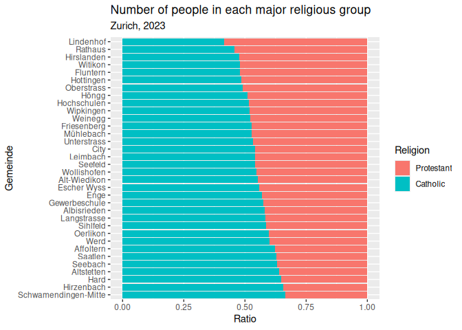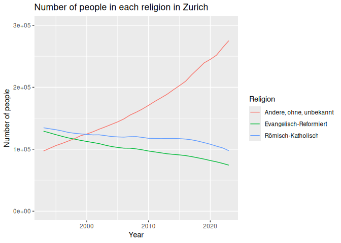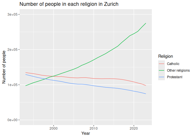 12 labs(13 title = "Number of people in each religion in Zurich",