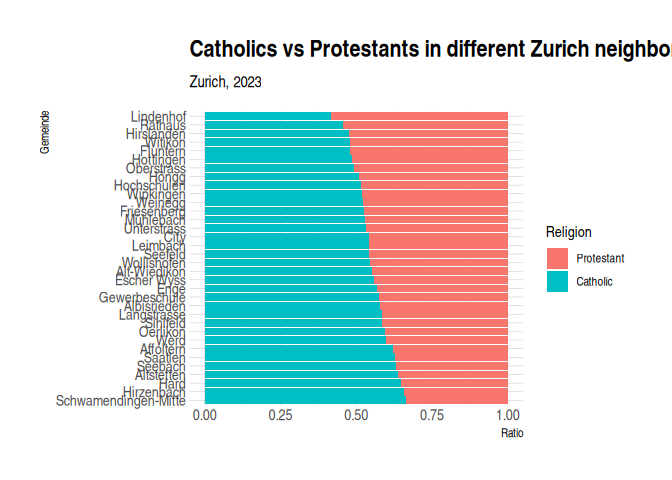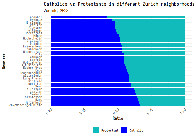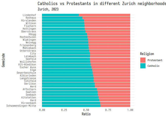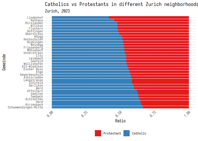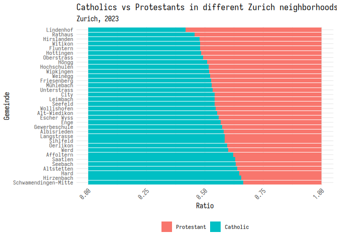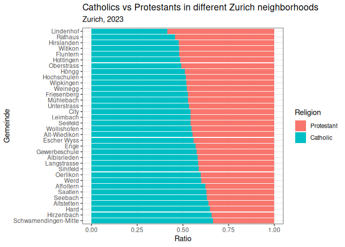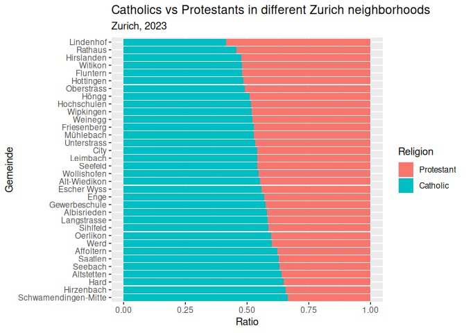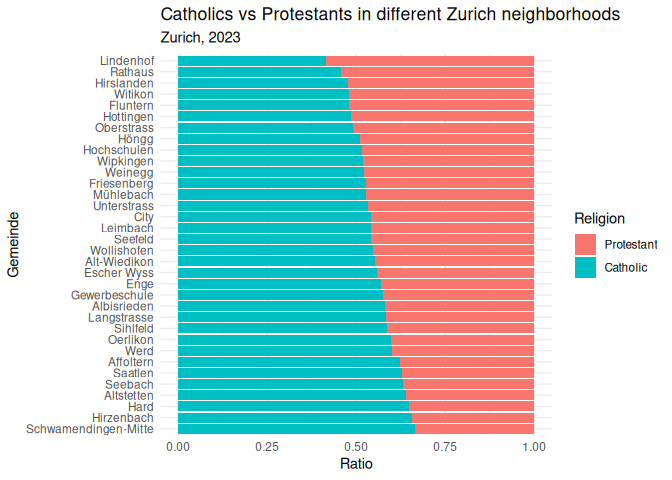 2 labs(3 title = "Catholics vs Protestants in different Zurich neighborhoods",