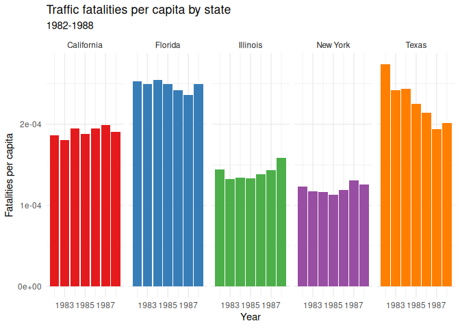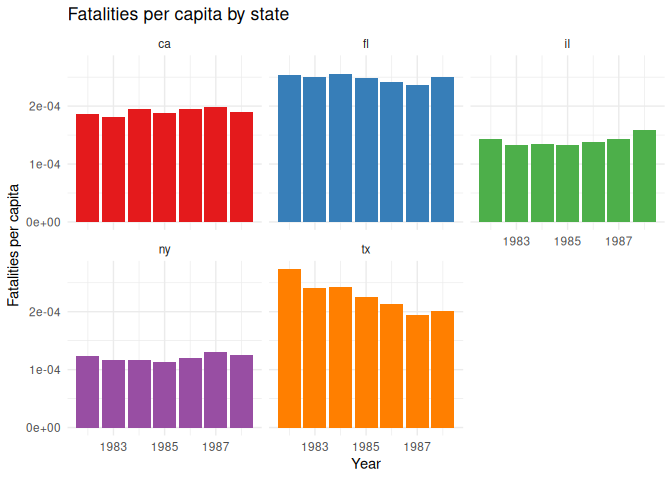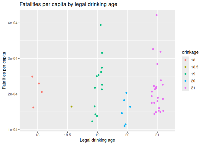 7 labs(title = "Fatalities per capita by legal drinking age", x = "Legal drinking age", y = "Fatalities per capita")