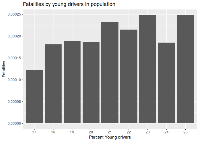 10 labs(title = "Fatalities by young drivers in population", x = "Percent Young drivers", y = "Fatalities")