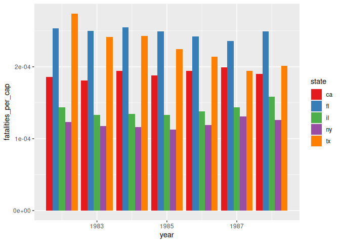 5 geom_col(aes(x=year, y=fatalities_per_cap, fill=state), position="dodge") +