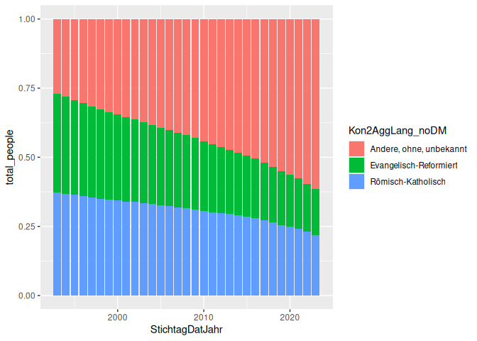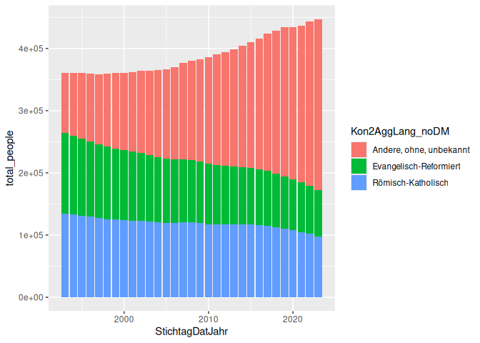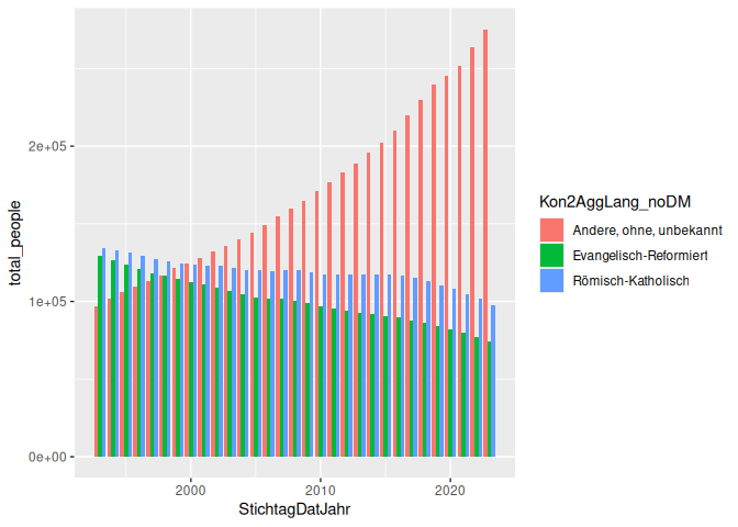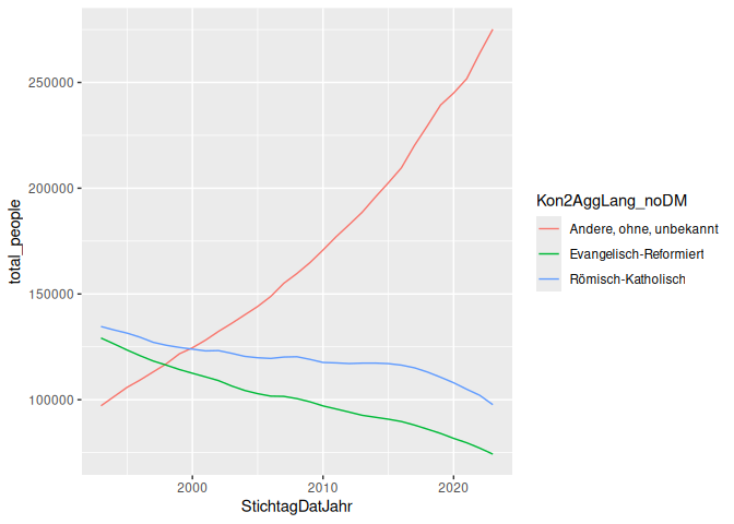 # A tibble: 93 × 3 # Groups: StichtagDatJahr [31] StichtagDatJahr Kon2AggLang_noDM total_people <dbl> <chr> <dbl> 1 1993 Andere, ohne, unbekannt 97129 2 1993 Evangelisch-Reformiert 129157 3 1993 Römisch-Katholisch 134612 4 1994 Andere, ohne, unbekannt 101494 5 1994 Evangelisch-Reformiert 126379 6 1994 Römisch-Katholisch 132975 7 1995 Andere, ohne, unbekannt 105868 8 1995 Evangelisch-Reformiert 123481 9 1995 Römisch-Katholisch 131477 10 1996 Andere, ohne, unbekannt 109342 # ℹ 83 more rows