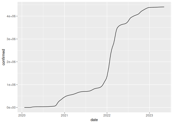Rows: 287,783 Columns: 47 $ id <chr> "8320791a", "8320791a", "8320791a"… $ date <date> 2020-03-13, 2020-03-14, 2020-03-1… $ confirmed <int> 2, 2, 2, 2, 8, 9, 9, 10, 10, 13, 1… $ deaths <int> NA, NA, NA, NA, NA, NA, NA, NA, NA… $ recovered <int> NA, NA, NA, NA, NA, NA, NA, NA, NA… $ tests <int64> NA, NA, NA, NA, NA, NA, NA, NA, … $ vaccines <int64> NA, NA, NA, NA, NA, NA, NA, NA, … $ people_vaccinated <int> NA, NA, NA, NA, NA, NA, NA, NA, NA… $ people_fully_vaccinated <int> NA, NA, NA, NA, NA, NA, NA, NA, NA… $ hosp <int> NA, NA, NA, NA, NA, NA, NA, NA, NA… $ icu <int> NA, NA, NA, NA, NA, NA, NA, NA, NA… $ vent <int> NA, NA, NA, NA, NA, NA, NA, NA, NA… $ school_closing <int> NA, NA, NA, NA, NA, NA, NA, NA, NA… $ workplace_closing <int> NA, NA, NA, NA, NA, NA, NA, NA, NA… $ cancel_events <int> NA, NA, NA, NA, NA, NA, NA, NA, NA… $ gatherings_restrictions <int> NA, NA, NA, NA, NA, NA, NA, NA, NA… $ transport_closing <int> NA, NA, NA, NA, NA, NA, NA, NA, NA… $ stay_home_restrictions <int> NA, NA, NA, NA, NA, NA, NA, NA, NA… $ internal_movement_restrictions <int> NA, NA, NA, NA, NA, NA, NA, NA, NA… $ international_movement_restrictions <int> NA, NA, NA, NA, NA, NA, NA, NA, NA… $ information_campaigns <int> NA, NA, NA, NA, NA, NA, NA, NA, NA… $ testing_policy <int> NA, NA, NA, NA, NA, NA, NA, NA, NA… $ contact_tracing <int> NA, NA, NA, NA, NA, NA, NA, NA, NA… $ facial_coverings <int> NA, NA, NA, NA, NA, NA, NA, NA, NA… $ vaccination_policy <int> NA, NA, NA, NA, NA, NA, NA, NA, NA… $ elderly_people_protection <int> NA, NA, NA, NA, NA, NA, NA, NA, NA… $ government_response_index <dbl> NA, NA, NA, NA, NA, NA, NA, NA, NA… $ stringency_index <dbl> NA, NA, NA, NA, NA, NA, NA, NA, NA… $ containment_health_index <dbl> NA, NA, NA, NA, NA, NA, NA, NA, NA… $ economic_support_index <dbl> NA, NA, NA, NA, NA, NA, NA, NA, NA… $ administrative_area_level <int> 1, 1, 1, 1, 1, 1, 1, 1, 1, 1, 1, 1… $ administrative_area_level_1 <chr> "Grand Princess", "Grand Princess"… $ administrative_area_level_2 <lgl> NA, NA, NA, NA, NA, NA, NA, NA, NA… $ administrative_area_level_3 <lgl> NA, NA, NA, NA, NA, NA, NA, NA, NA… $ latitude <dbl> NA, NA, NA, NA, NA, NA, NA, NA, NA… $ longitude <dbl> NA, NA, NA, NA, NA, NA, NA, NA, NA… $ population <int> 3533, 3533, 3533, 3533, 3533, 3533… $ iso_alpha_3 <chr> NA, NA, NA, NA, NA, NA, NA, NA, NA… $ iso_alpha_2 <chr> NA, NA, NA, NA, NA, NA, NA, NA, NA… $ iso_numeric <int> NA, NA, NA, NA, NA, NA, NA, NA, NA… $ iso_currency <chr> NA, NA, NA, NA, NA, NA, NA, NA, NA… $ key_local <lgl> NA, NA, NA, NA, NA, NA, NA, NA, NA… $ key_google_mobility <chr> NA, NA, NA, NA, NA, NA, NA, NA, NA… $ key_apple_mobility <chr> NA, NA, NA, NA, NA, NA, NA, NA, NA… $ key_jhu_csse <chr> NA, NA, NA, NA, NA, NA, NA, NA, NA… $ key_nuts <lgl> NA, NA, NA, NA, NA, NA, NA, NA, NA… $ key_gadm <chr> NA, NA, NA, NA, NA, NA, NA, NA, NA…