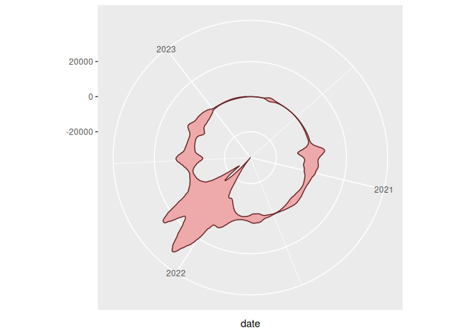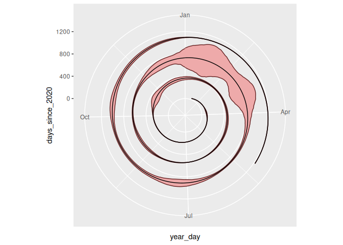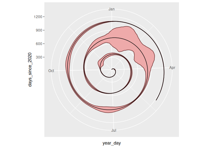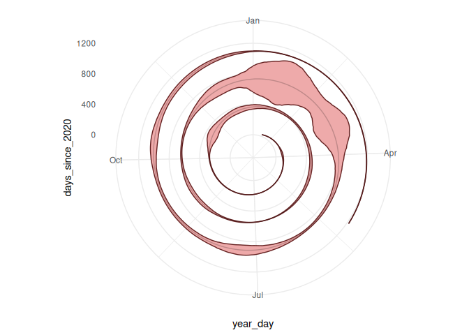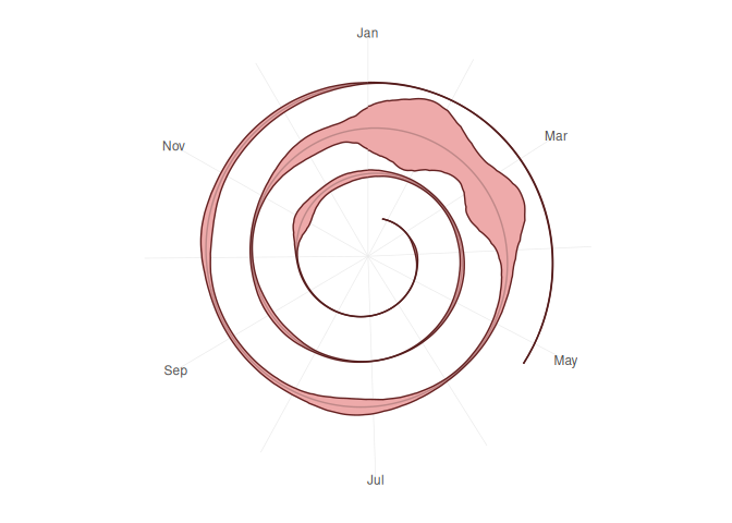 Now, we can actually just add our two Y axes together, and we’ll get a spiral chart with a ribbon plot. It’s perfectly valid to do a little light calculation inside ggplot itself.